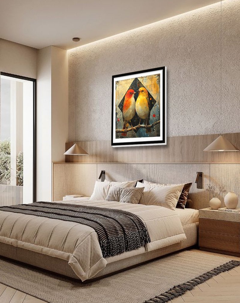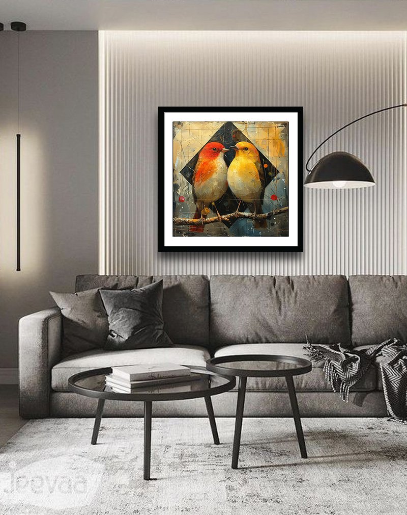 This artwork depicts two small birds perched close together on a branch, one in warm red‑orange tones and the other in soft buttery yellow, set against a textured abstract backdrop with a dark diamond shape and splashes of teal and orange. The blend of painterly brushstrokes, geometric forms, and a teal‑and‑amber palette gives it a contemporary yet cosy look that works well in living rooms, hallways, or bedrooms with modern or eclectic decor.
