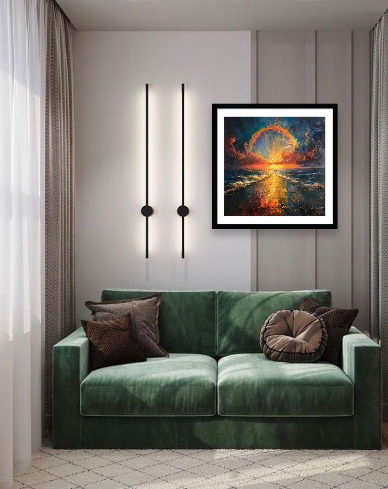 A radiant sun bursts through stormy clouds, forming a glowing rainbow halo that hovers above shimmering ocean waves and a golden path of light. The dramatic brushstrokes and fiery colors create an atmospheric, uplifting artwork ideal for living rooms, hallways, and creative spaces.