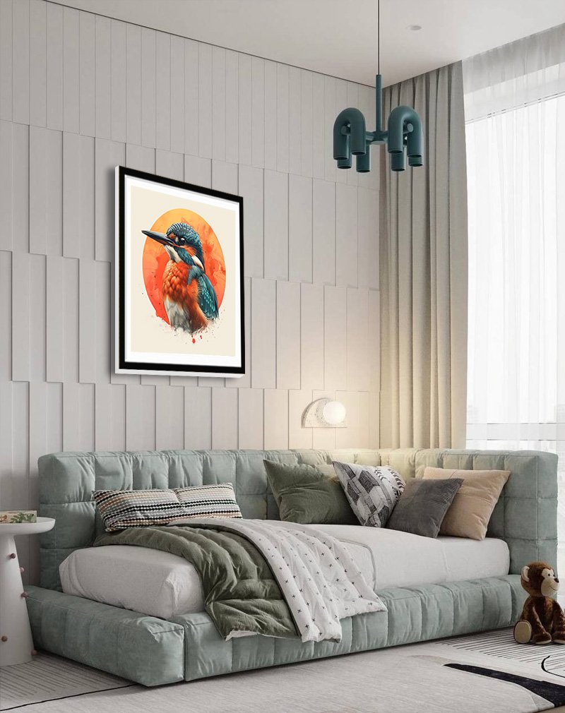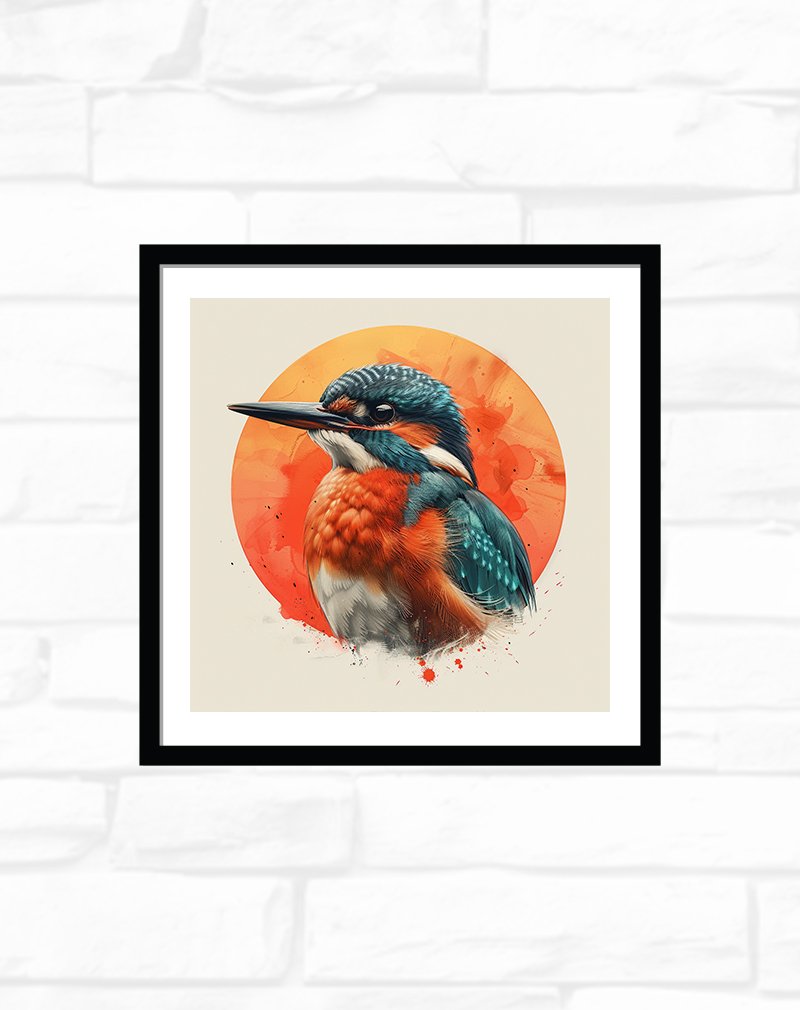 This artwork presents a detailed kingfisher portrait with teal‑blue wings, bright orange breast, and crisp white highlights, set against a bold sun‑like orange circle that splashes softly into the neutral background. The clean composition and modern orange‑teal palette give it a contemporary graphic feel, making it perfect for adding energetic color and a nature‑inspired focal point to living rooms, offices, or creative studios.