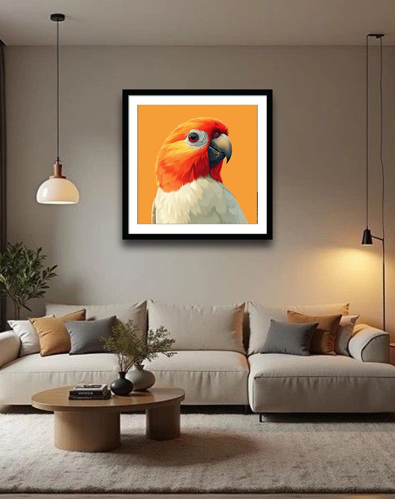 This artwork features a sleek, minimalist parrot portrait with fiery orange and red head feathers, soft cream plumage, and a bold dark beak set against a flat orange backdrop, creating a clean, graphic pop‑art look. The strong color blocking and modern illustration style make it ideal for contemporary spaces that need an energetic accent, from living rooms to creative studios or kids’ rooms.