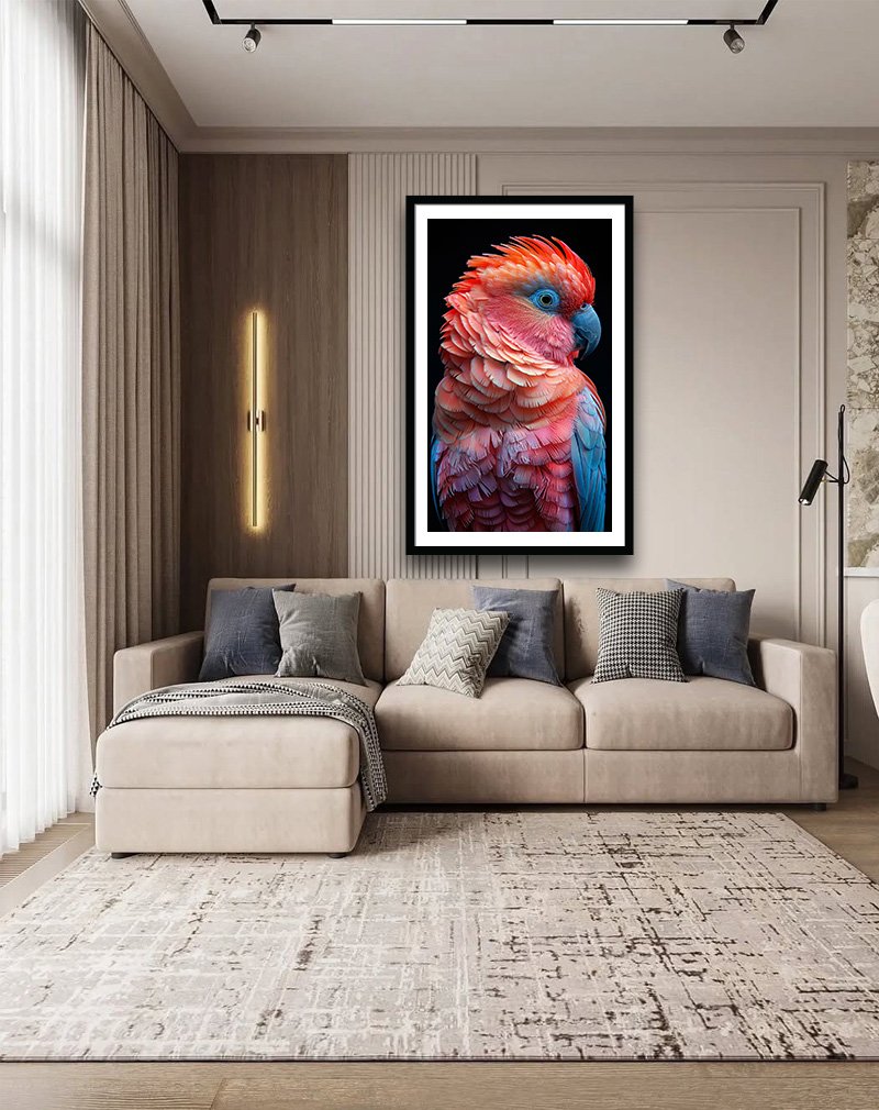 This artwork presents a close‑up portrait of an exotic parrot with lush overlapping feathers that shift from soft coral pink to vivid red‑orange, contrasted by cool teal‑blue wings and a deep blue beak against a black background. The rich pink‑and‑teal palette gives it a dreamy yet modern feel, making it perfect as a bold accent piece for bedrooms, studios, or living rooms that embrace colourful, contemporary decor
