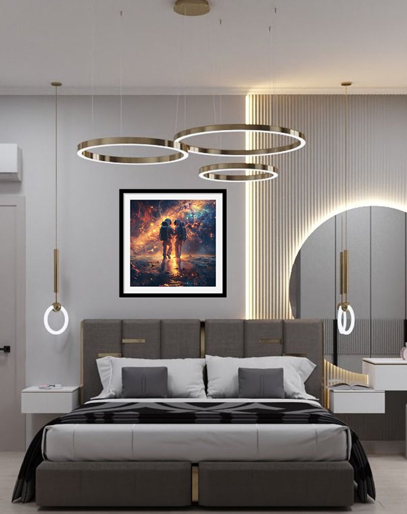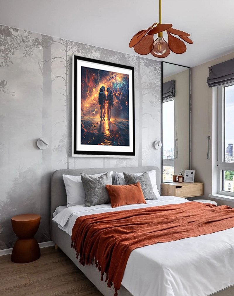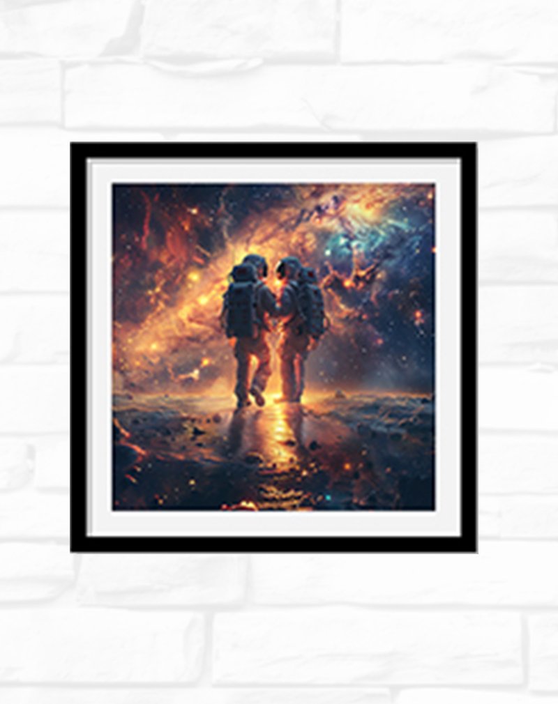 This artwork portrays two astronauts standing hand in hand on an alien landscape, illuminated by the fiery glow of swirling galaxies and nebulae in the sky above. Space‑themed couple art like this adds a bold, futuristic focal point to modern interiors, symbolizing adventure, connection, and love that stretches beyond earthly limits.