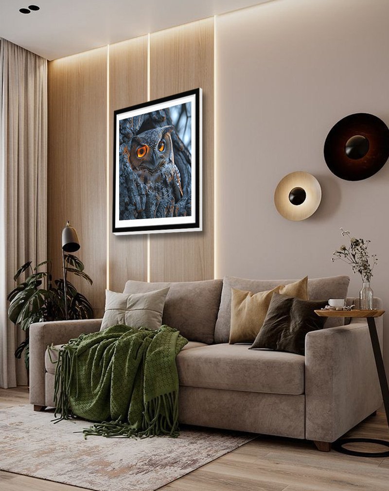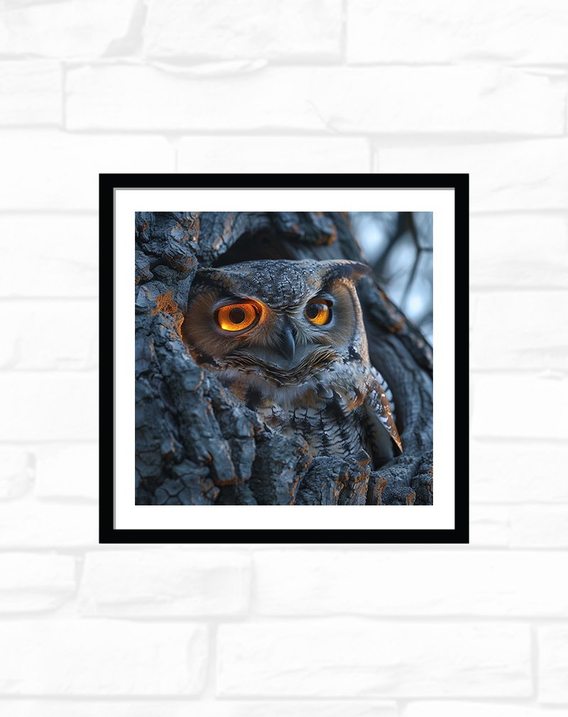 This artwork showcases a mysterious owl snug in a dark, charred‑looking tree hollow, its glowing amber‑orange eyes and subtle brown‑grey feathers dramatically highlighted against the cool blue‑black bark. The strong contrast between the fiery eyes and the shadowy trunk gives the piece a cinematic, night‑time mood that suits modern living rooms, offices, or moody reading corners that need a bold statement.