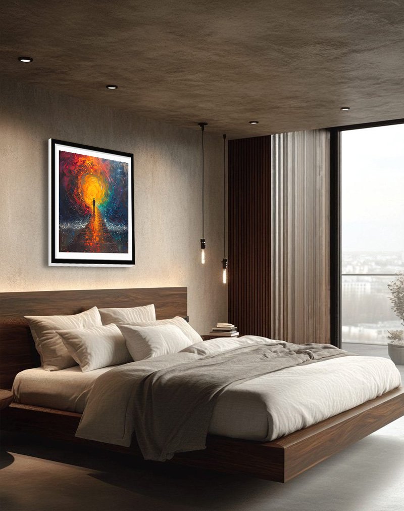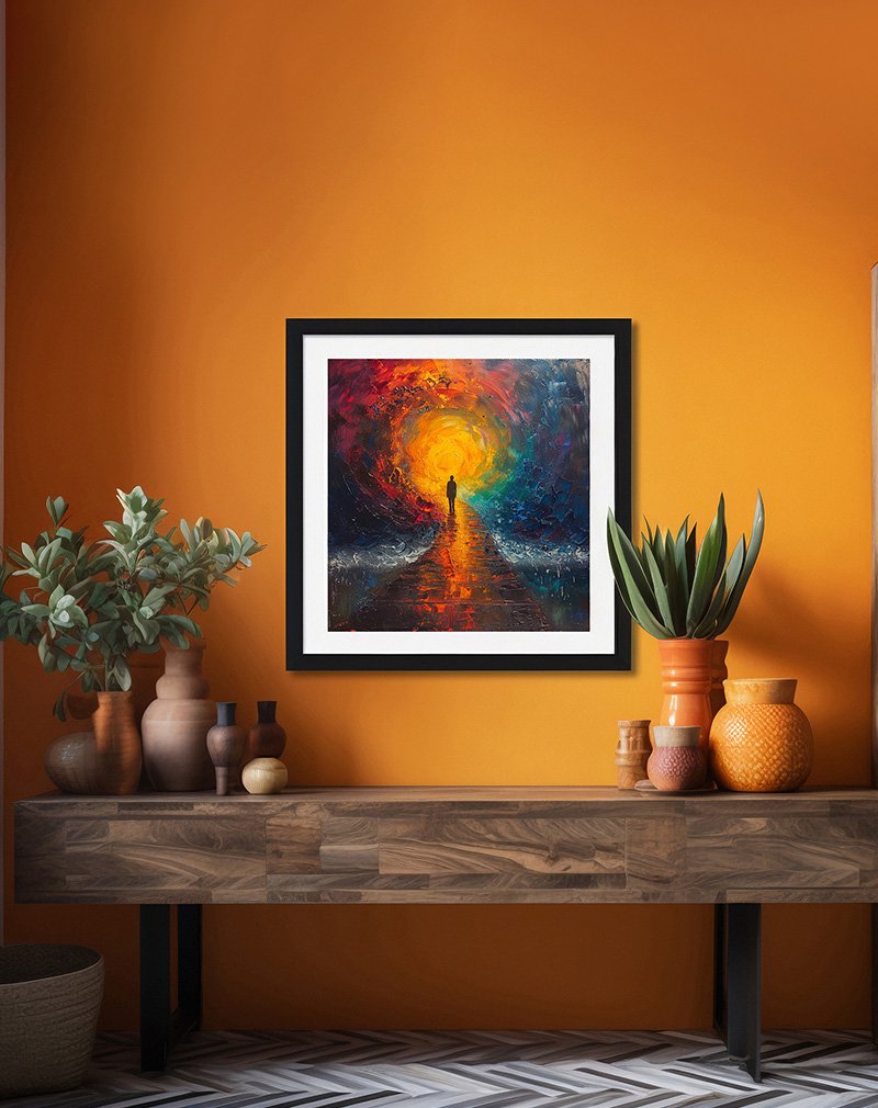 Solar Flare Macaw showcases a vivid blue‑and‑gold macaw captured mid‑flight, its wings fanning out over a burst of fiery orange and yellow splashes that glow like a miniature sunrise. The crisp white background and sharp feather details keep the artwork modern and clean, making it a striking centerpiece for living rooms, studios, or offices that need a hit of color and energy.