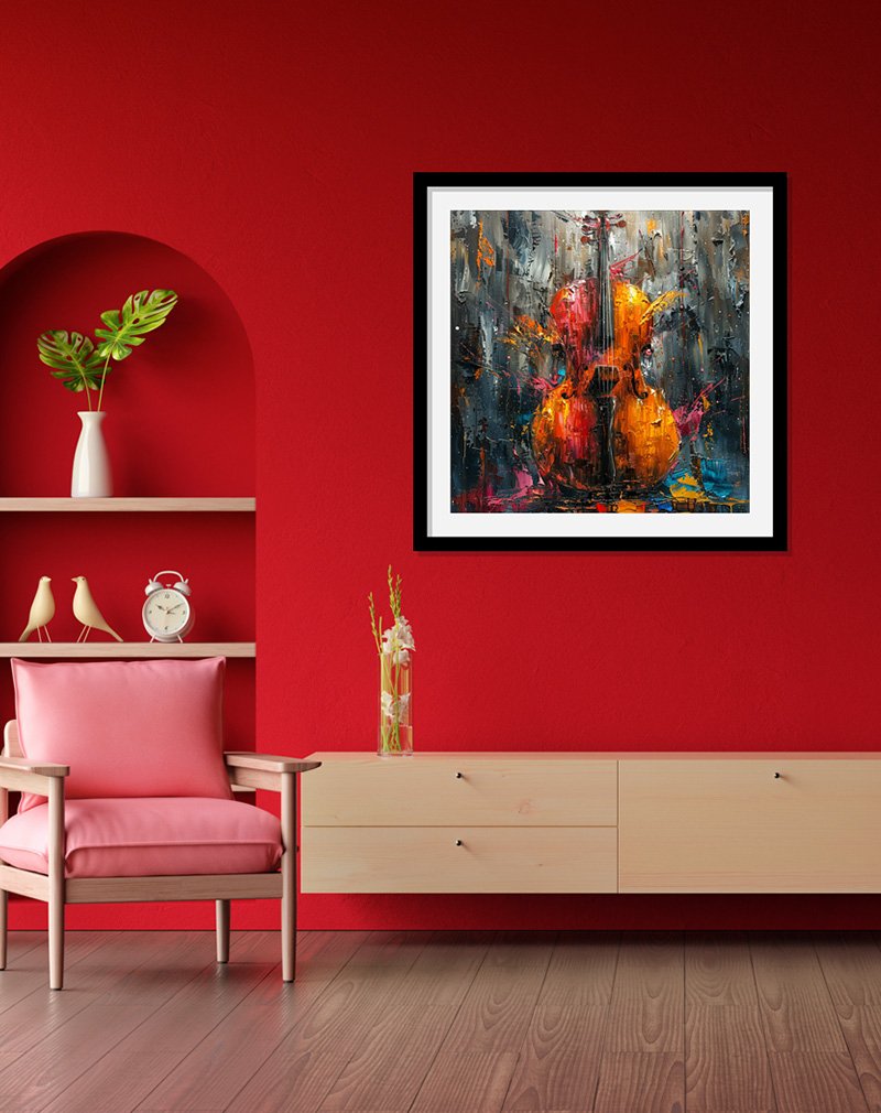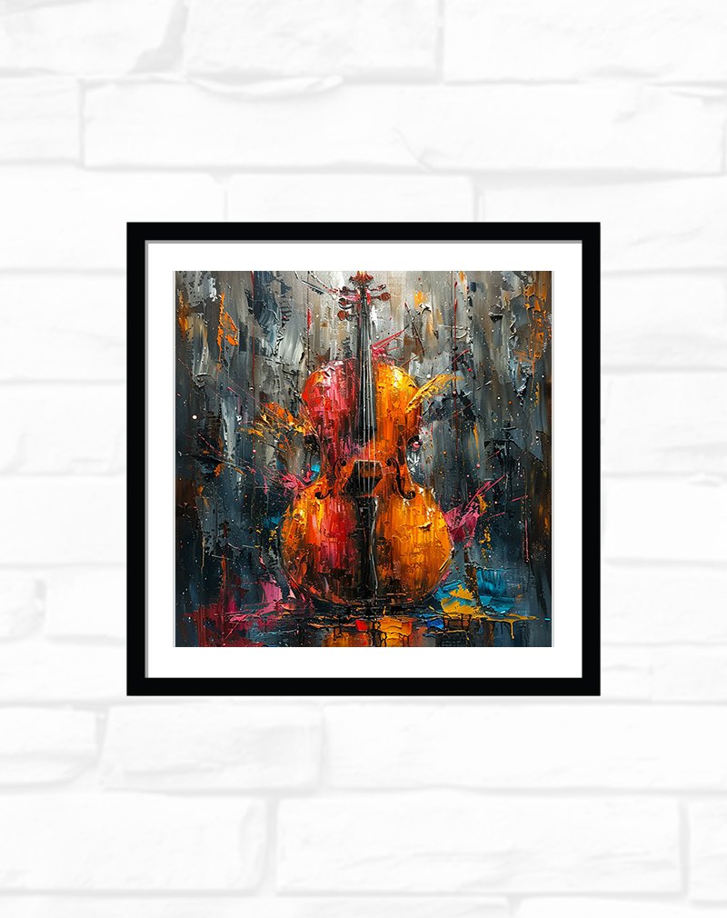 This expressive artwork presents a glowing violin painted in fiery oranges, reds, and golds, standing out against a moody, textured backdrop of deep blues and greys. Energetic splashes and dripping strokes capture the passion of live performance, making it a dramatic centerpiece for music rooms, studios, or bold contemporary interiors.
