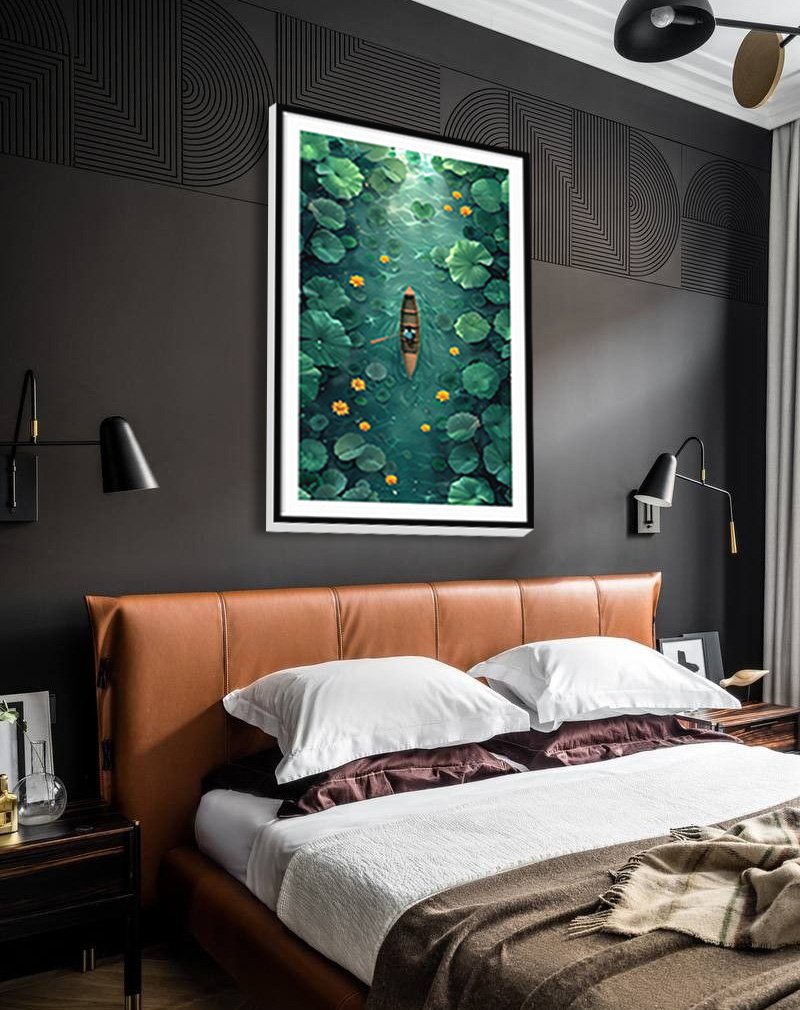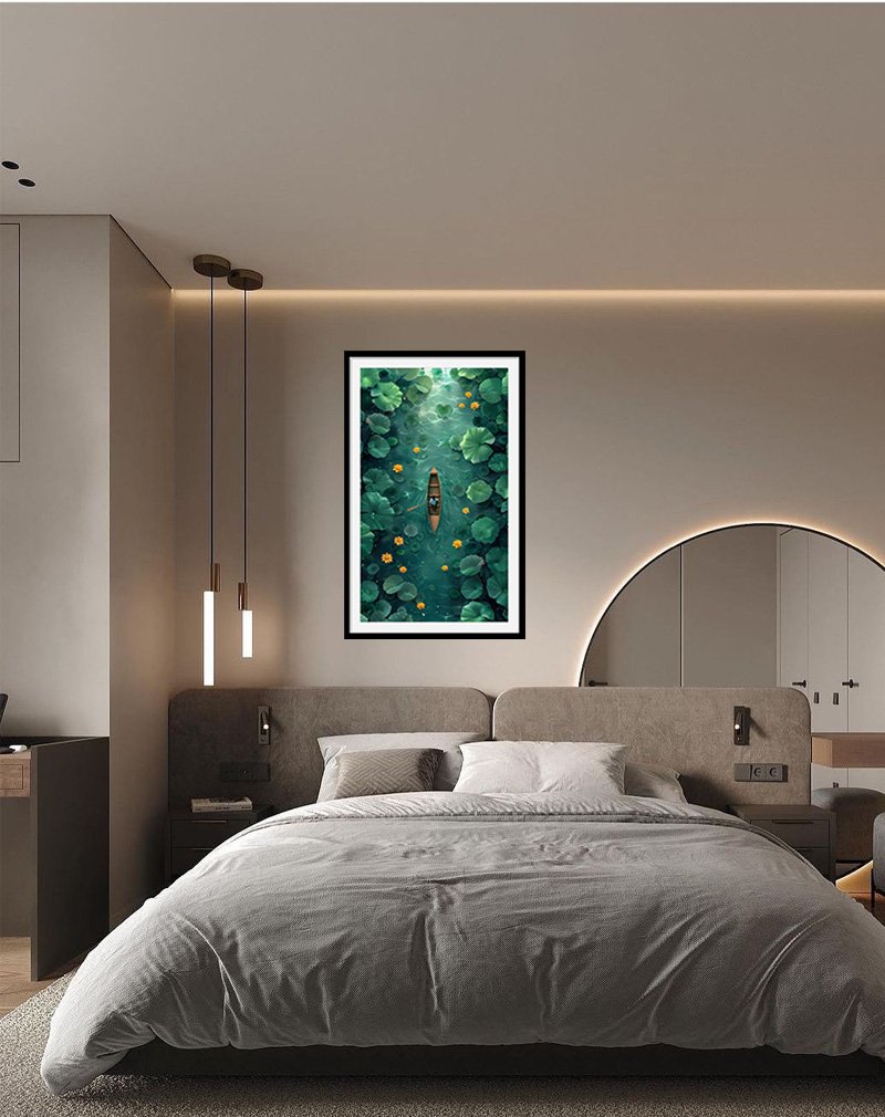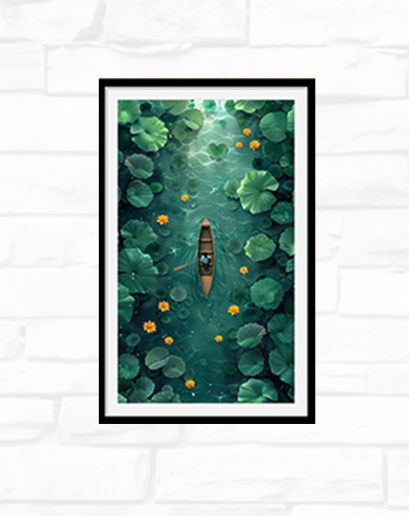 This serene artwork captures a top-view wooden boat gliding through clear teal water, surrounded by lush green lotus leaves and scattered golden blossoms. The tranquil composition and cool, refreshing palette make it perfect for creating a peaceful, meditative mood in living rooms, bedrooms, or spa-inspired spaces.