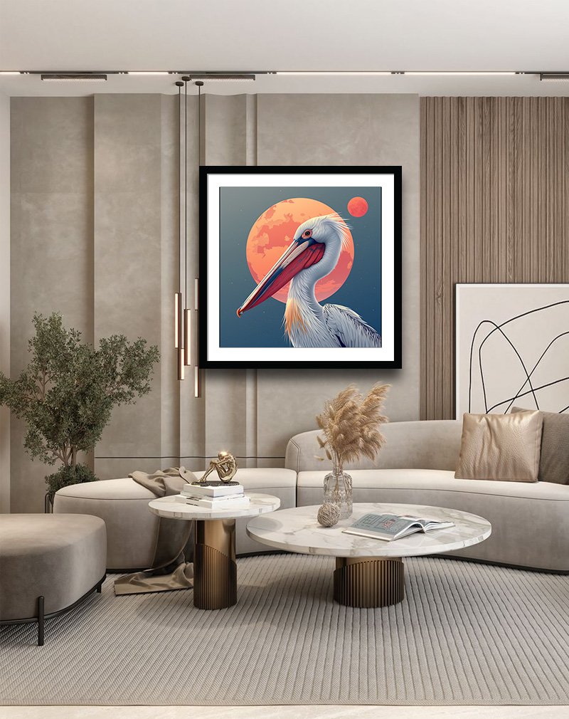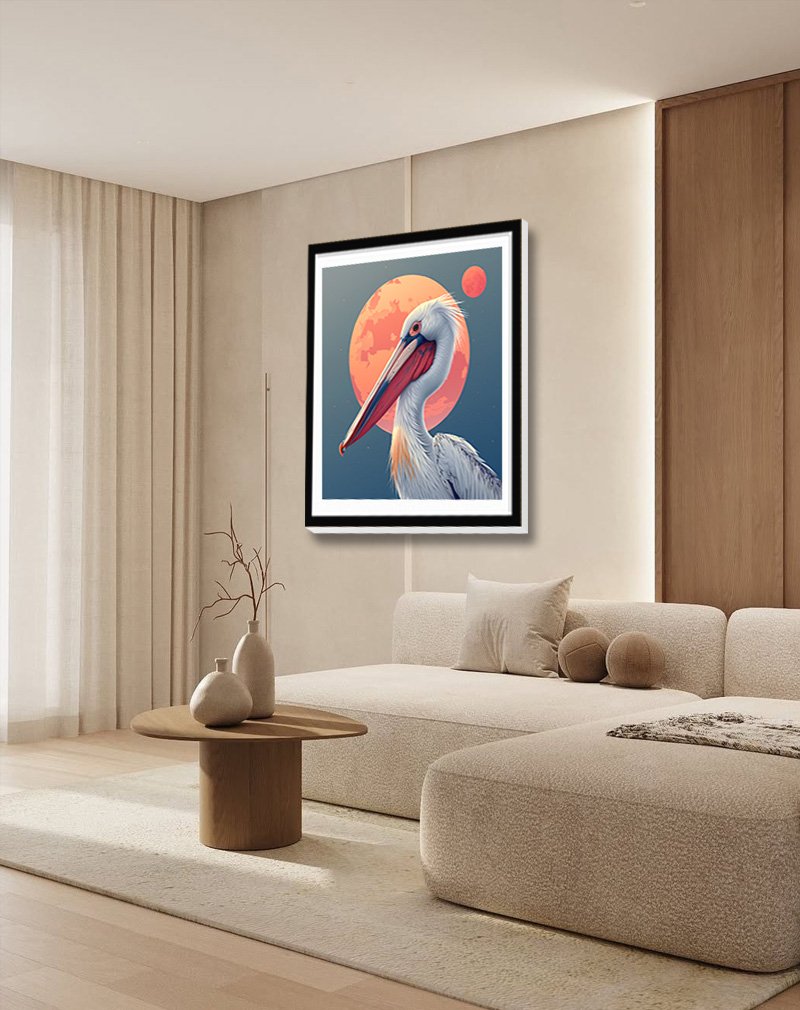 This striking illustration features a dignified pelican set against twin coral moons glowing in a deep teal sky, blending coastal wildlife with dreamy, celestial vibes. The bold contrast of warm and cool tones makes it a standout piece for modern living rooms, studios, or bedrooms that need a serene yet eye‑catching focal point.