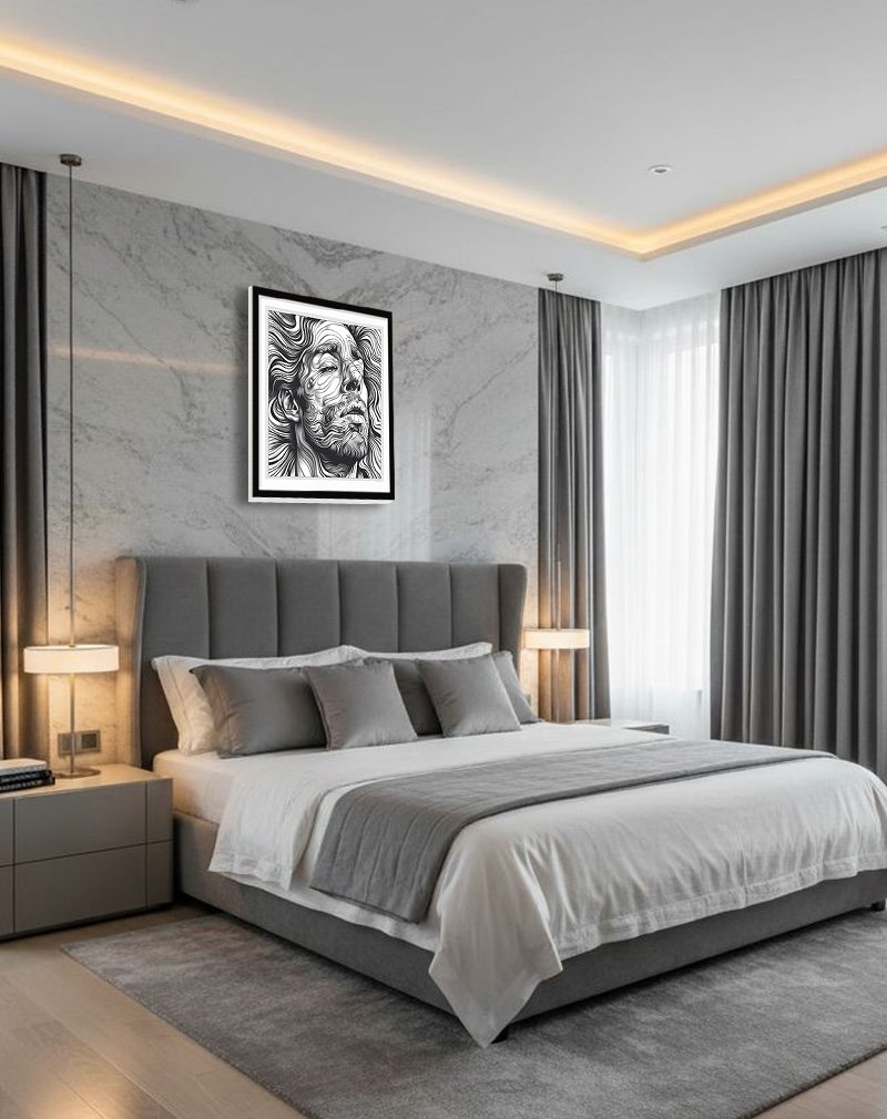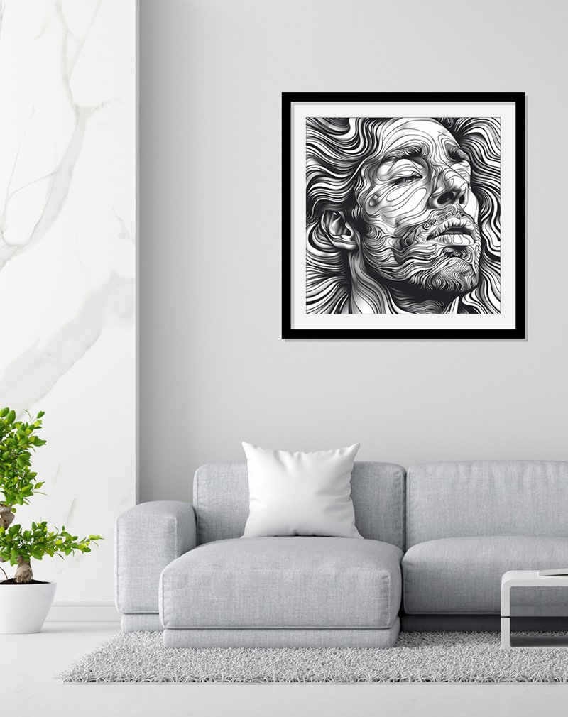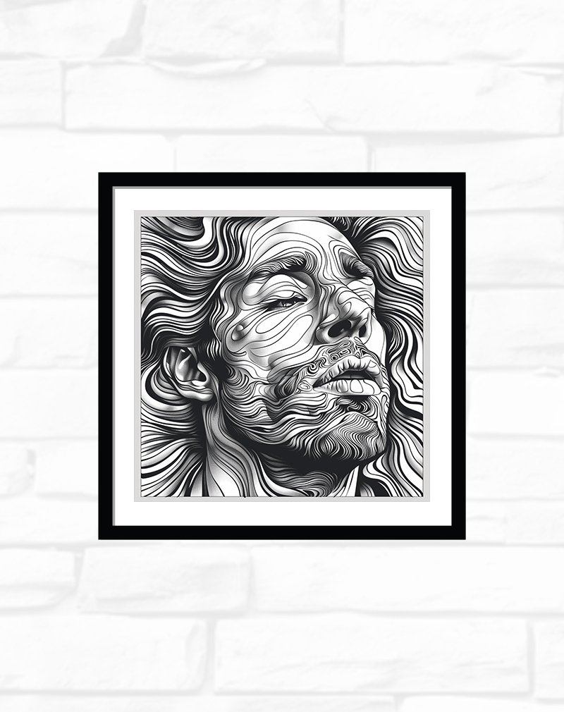 This artwork portrays a serene face emerging from a sea of flowing black‑and‑white contours, with every swirl of line art suggesting movement, emotion, and quiet introspection. The intricate waves of ink create a hypnotic, topographic effect that feels both modern and timeless, making it a striking centerpiece for minimalist, monochrome, or design‑forward interiors
