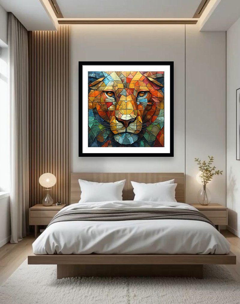 A commanding lion’s face emerges from a rich mosaic of jewel-toned geometric tiles, blending warm golds, reds, and cool blues into a striking abstract portrait. The intense gaze and stained-glass style texture give this wall art a bold, regal presence that instantly elevates living rooms, offices, and creative studios.