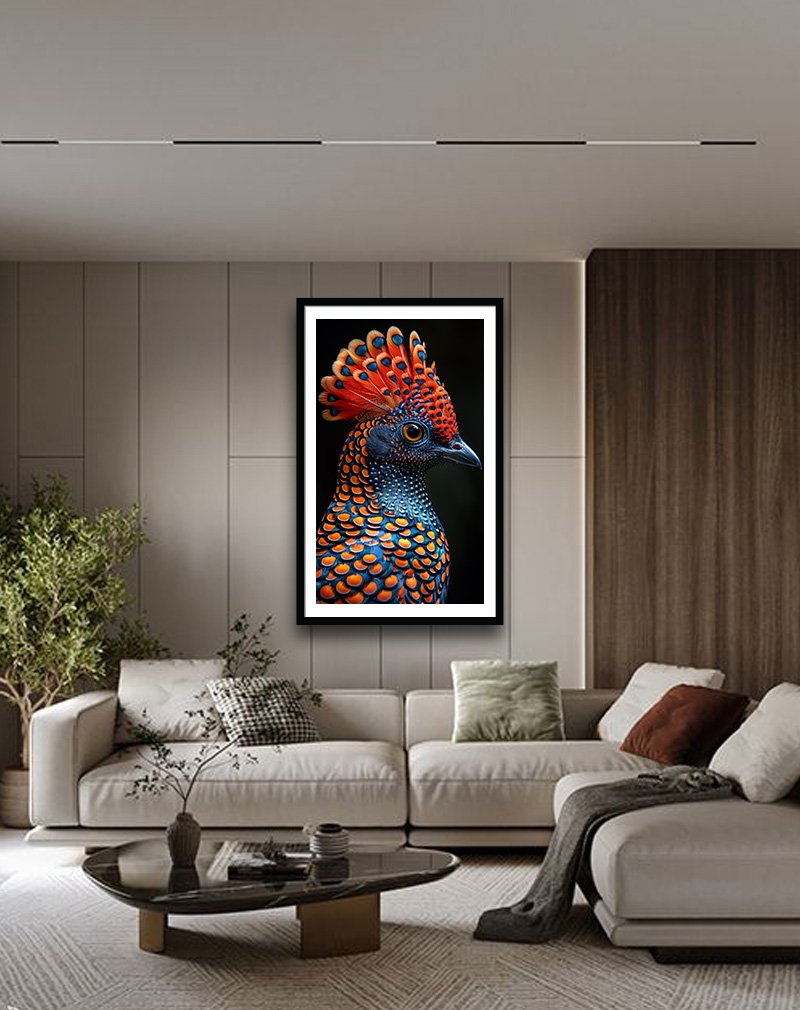 This artwork features an exotic, crested bird in vivid navy and teal blues covered with bold orange circular markings, topped by a dramatic fan of red‑orange feathers with deep blue spots. The intense contrast of the orange‑and‑blue palette against a dark background gives it a futuristic, almost neon look that works well as a statement piece in modern living rooms, offices, or creative studios.