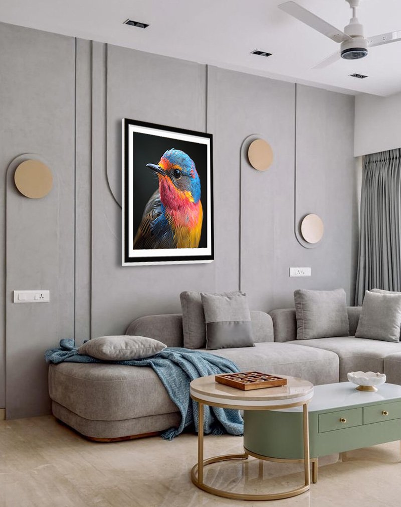 This artwork shows a close‑up portrait of a small bird with striking rainbow plumage—turquoise blues, hot pinks, oranges, and golden yellows—set against a deep, dark background for maximum contrast. Vivid multicolor bird portraits like this bring energy, creativity, and a modern pop of color into interiors, working especially well in studios, hallways, or kids’ rooms that need a bold focal point.