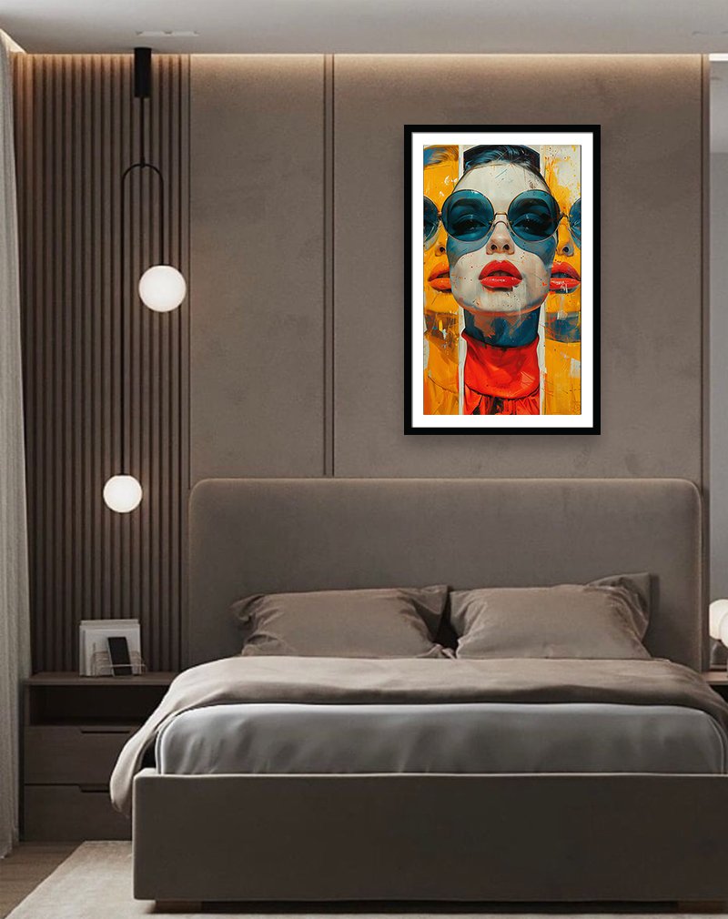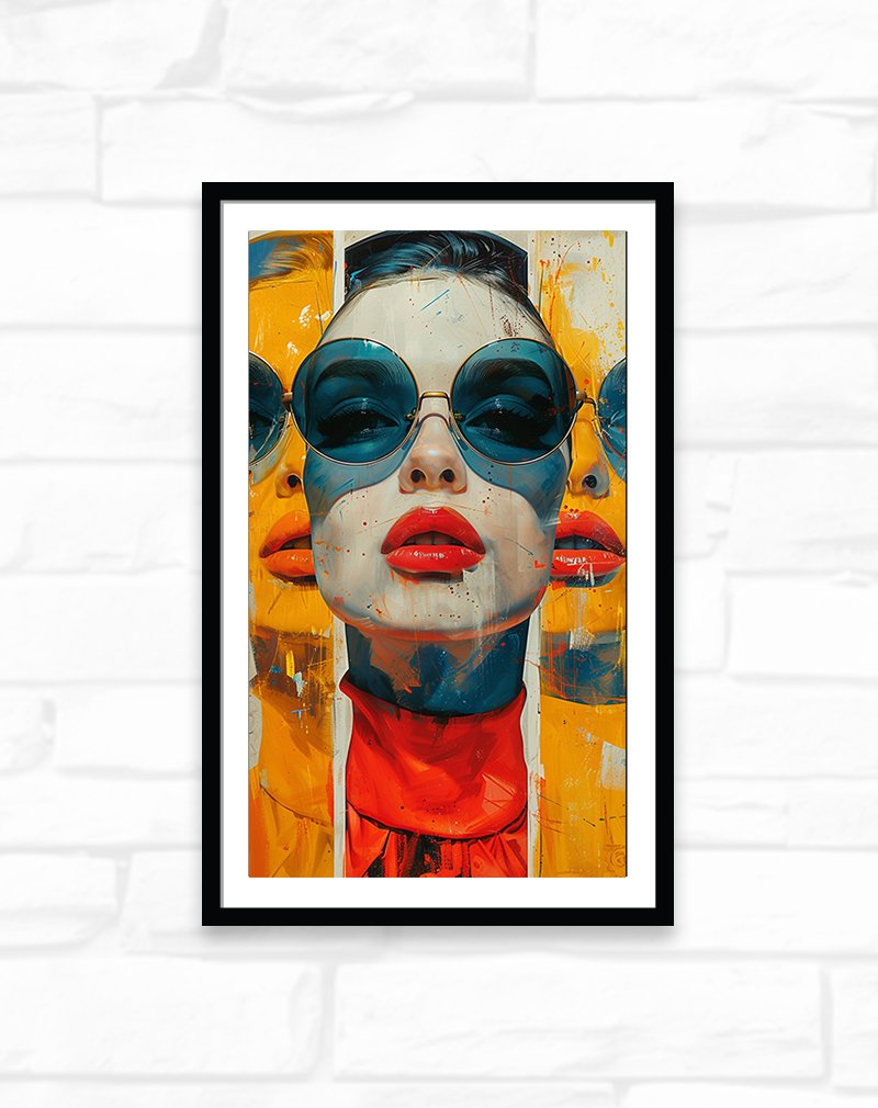Bold blocks of color and brushy textures frame a stylish trio of faces in oversized sunglasses, creating a fun, retro-inspired pop art vibe. The vivid yellows, reds, and blues make this piece a striking focal point for modern living rooms, studios, or trendy café walls.
