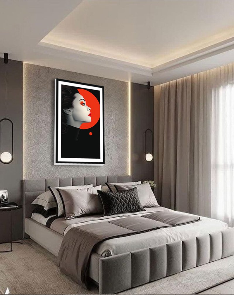 A mysterious female silhouette emerges from deep black shadows, partially lit by a bold red question-mark shape that curves around her profile. The stark contrast, minimal color palette, and thoughtful composition create a sophisticated modern piece perfect for offices, studios, and statement walls.