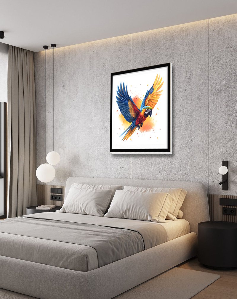 Solar Flare Macaw captures a vibrant macaw mid‑flight, its cobalt‑blue and golden‑orange wings bursting outward from a glowing splash of sunlit color on crisp white. The bold macaw‑inspired palette adds instant energy and movement, making this piece perfect for brightening modern living rooms, creative studios, or office spaces that crave a dramatic focal point.