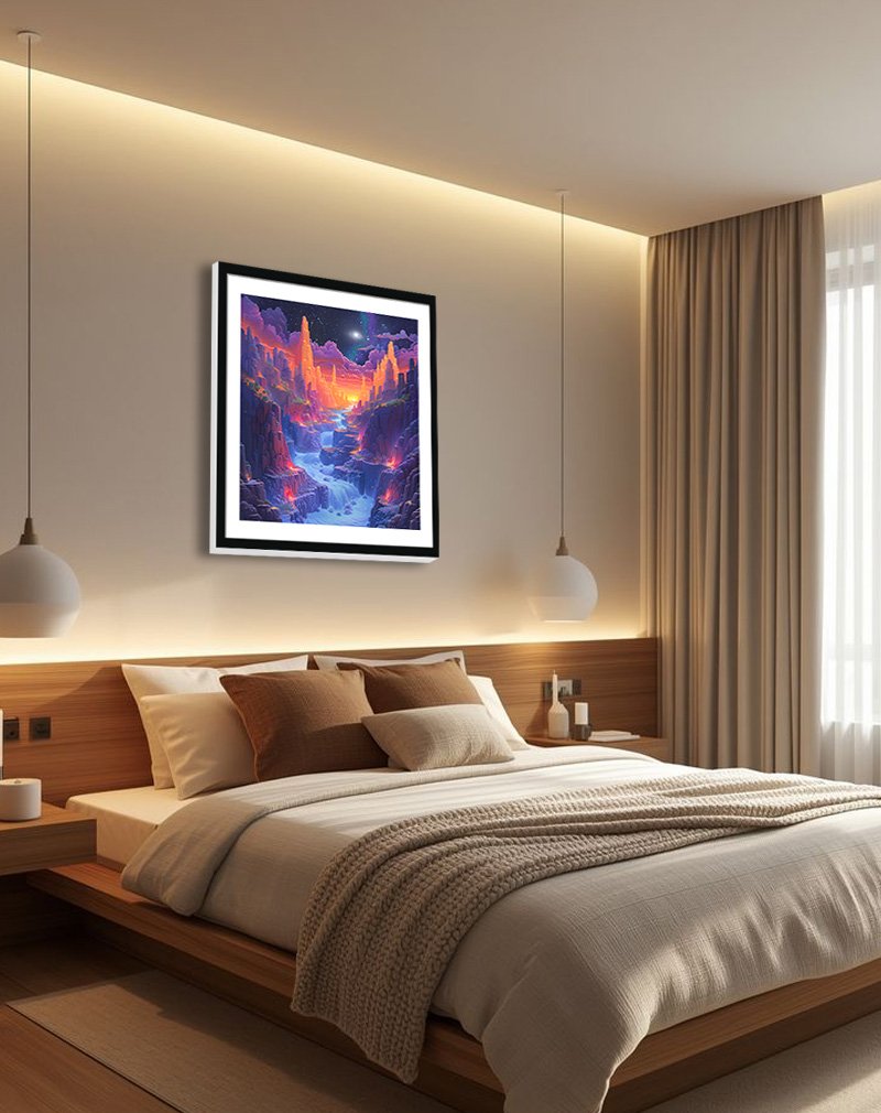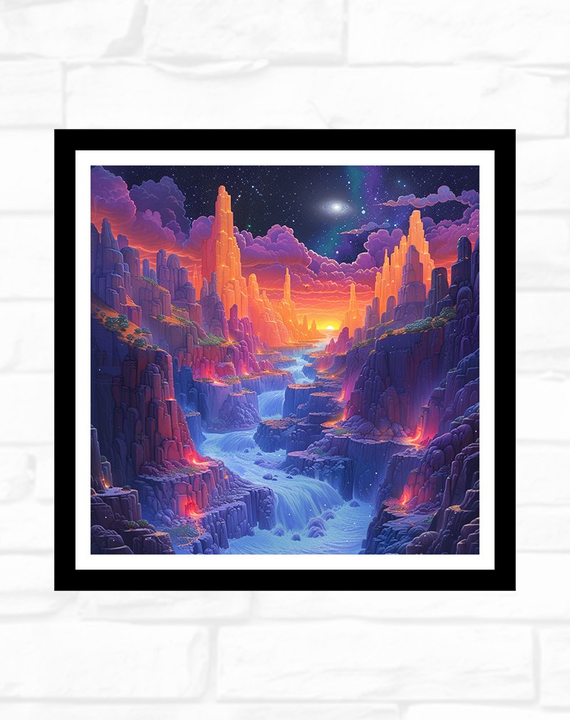 This vibrant digital illustration portrays a glowing canyon of neon-lit cliffs, cascading blue waters, and a sparkling star-filled sky, blending fantasy and sci‑fi energy in one dramatic scene. Offered as a high-resolution digital file, it can be printed in multiple sizes to create a bold, imagination-sparking focal point in living rooms, gaming rooms, or creative studios.
