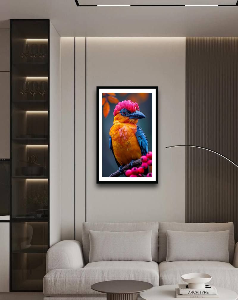 This artwork shows a bright songbird with a hot‑pink crest, fiery orange‑yellow chest, and teal‑blue wings perched on a berry‑laden branch against a soft teal background. The vivid magenta‑orange‑teal palette and autumnal bokeh in the background create a playful yet sophisticated look that works beautifully in kids’ rooms, creative studios, or any modern space that embraces bold colour.