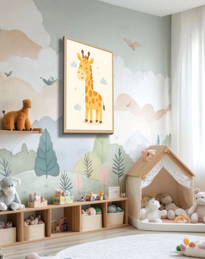 This adorable wall decal features a smiling cartoon giraffe surrounded by soft clouds and stars in gentle pastel tones, perfect for creating a cozy, playful nursery or kids’ room. The peel-and-stick design makes it easy to apply, remove, and reposition without damaging walls, so the room can grow and change along with your child’s imagination.