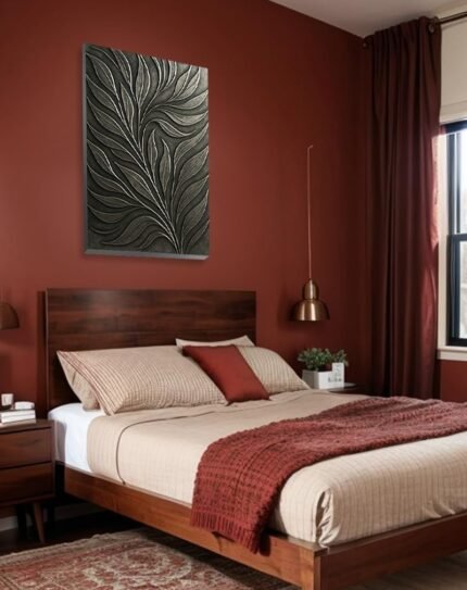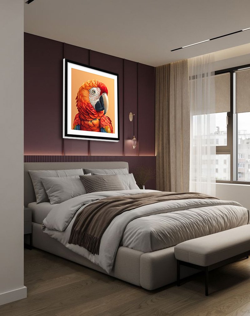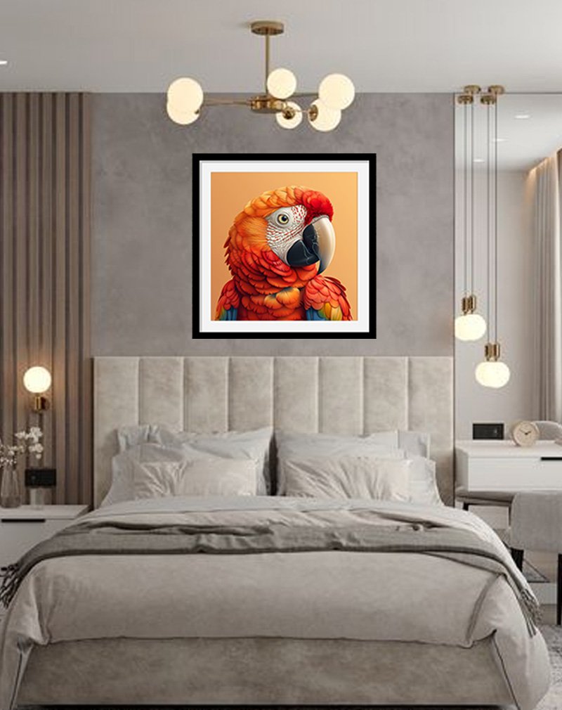 This framed portrait showcases a richly detailed scarlet macaw with layered red, orange, and gold feathers set against a warm peach background, highlighting the bird’s exotic beauty. Tropical bird art like this injects bold color and energy into interiors, making it ideal for feature walls in living rooms, studios, or playful eclectic spaces