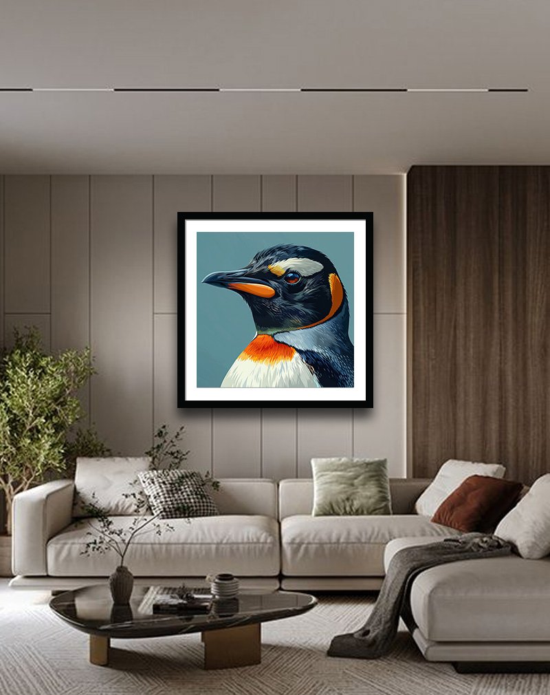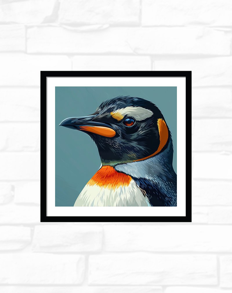 This artwork shows a sleek seabird‑style portrait with inky blue‑black feathers, a bright orange beak, and a vivid orange‑and‑gold patch on the chest and neck, set against a smooth teal background. The clean, graphic rendering and bold teal‑and‑orange palette give it a fresh, modern look that works beautifully in coastal, minimalist, or contemporary interiors.