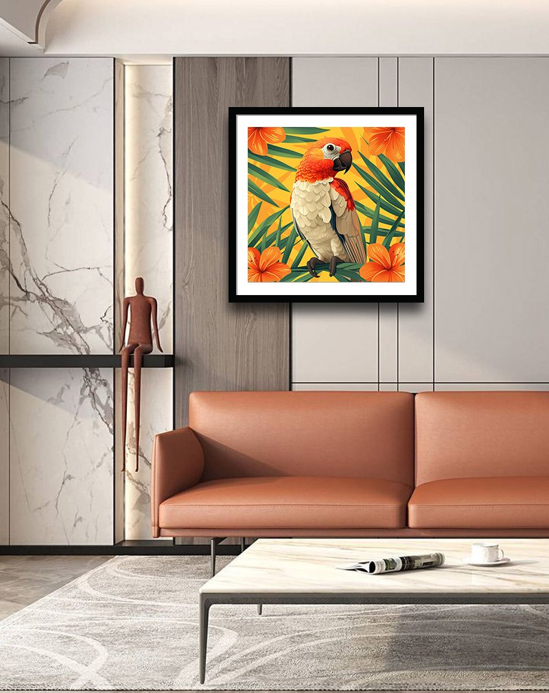 This artwork features a vibrant parrot perched amid lush green palm leaves, its warm cream and orange plumage echoed by bold orange hibiscus‑style flowers against a sunny yellow background. The high‑energy tropical palette and playful illustration style make it perfect for brightening living rooms, kids’ rooms, or any space aiming for a fun, vacation‑inspired vibe.