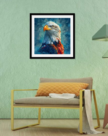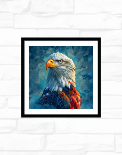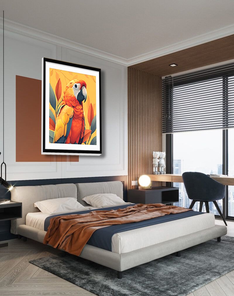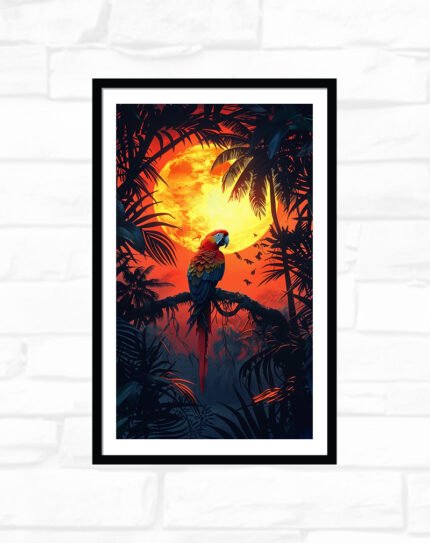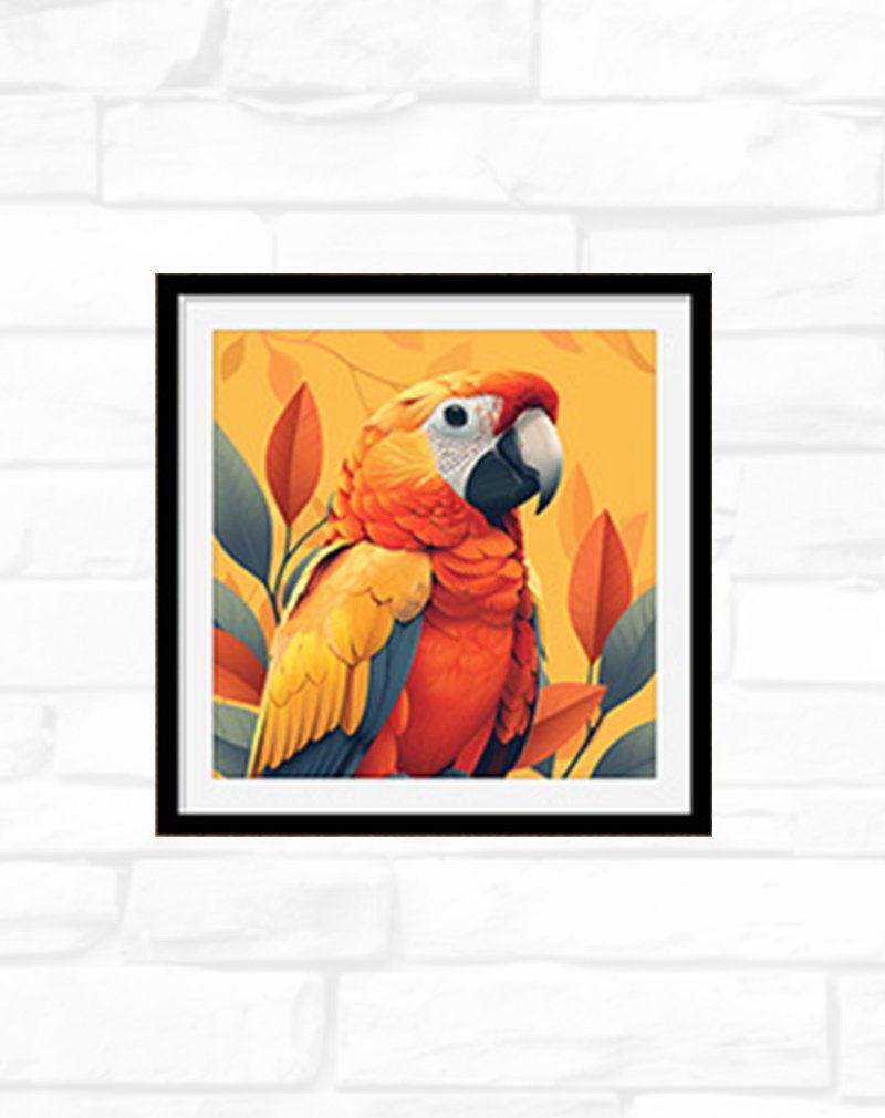 This framed wall art features a vivid parrot in fiery orange, gold, and deep teal feathers set against a warm tropical backdrop of stylized leaves. The bold colors and detailed illustration add energy and a touch of exotic nature to living rooms, offices, or any space that needs a vibrant focal point.