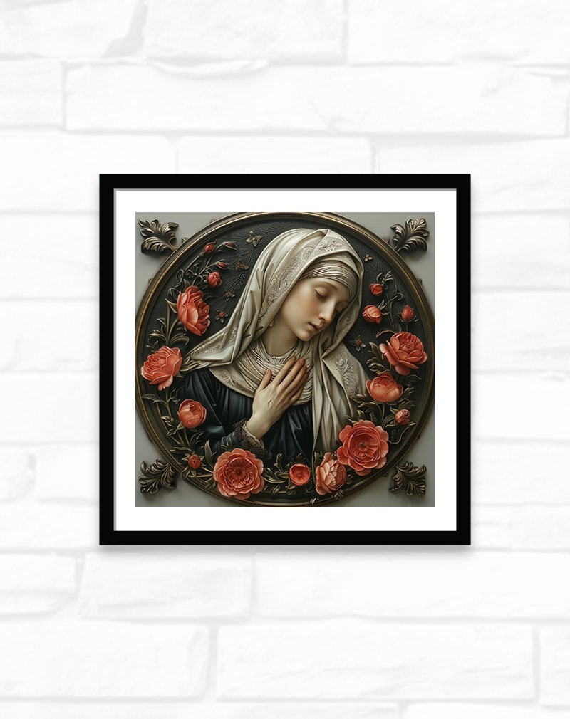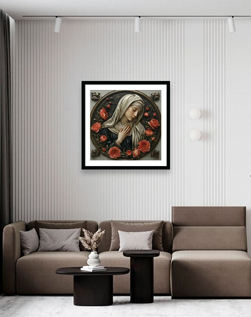 A graceful robed figure folds their hands in prayer within an ornate circular frame, surrounded by sculpted coral roses and delicate leaves. The antique tones, fine detailing, and warm floral accents give this wall art a classic, devotional feel ideal for traditional interiors, prayer corners, and elegant living rooms.