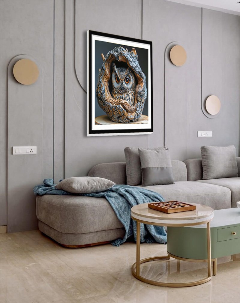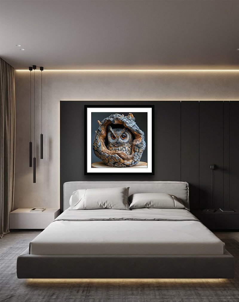 This artwork features a highly detailed owl sculpture nestled inside a rough tree hollow, its intense orange eyes and textured feathers standing out against the rugged bark. Owl statues and art are widely used in decor to symbolize wisdom, intuition, protection, and prosperity, making a piece like this ideal for study rooms, offices, or meditation corners.