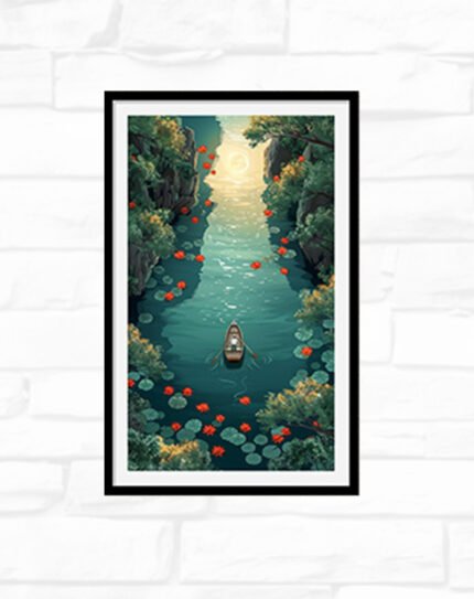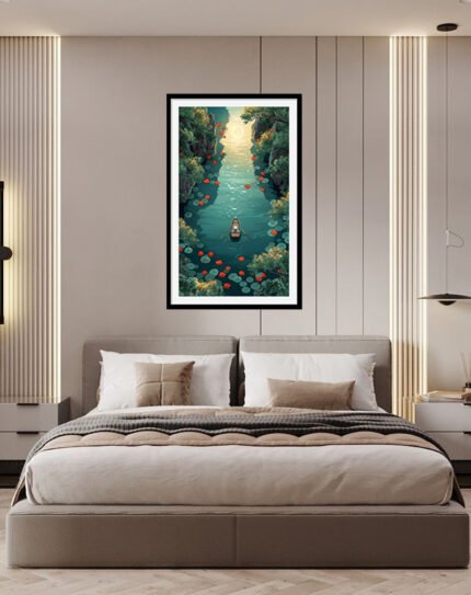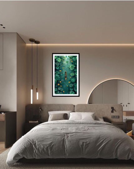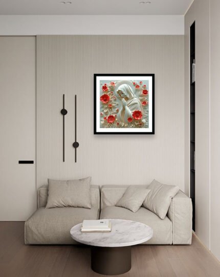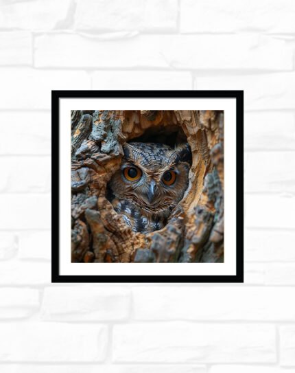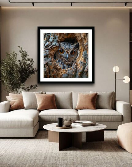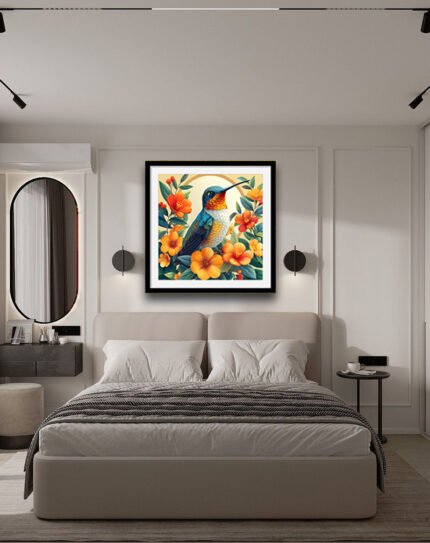 This artwork portrays two small birds perched closely on a tree stump, one with warm mustard‑yellow plumage and the other with soft gray and red, set against a distressed cream background with geometric blocks of red, blue, and beige. The mix of cosy earth tones, mustard accents, and abstract shapes gives it a modern yet rustic feel, ideal for bedrooms, living rooms, or gallery walls that blend nature themes with contemporary design.